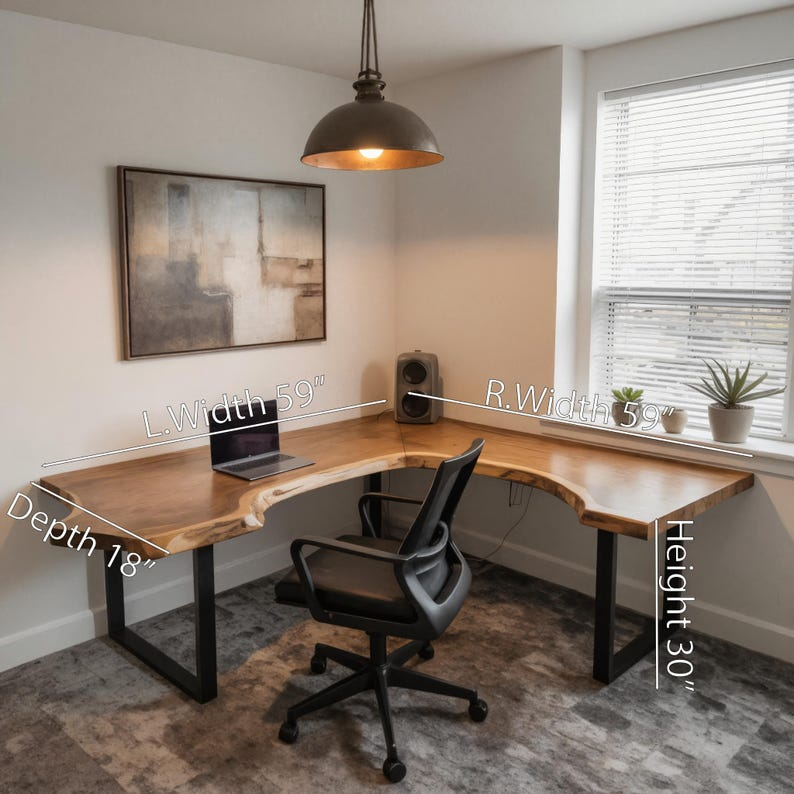 This wooden desk features an L-shaped structure designed for corner placement. The surface provides a stable and spacious area for everyday workspace use.